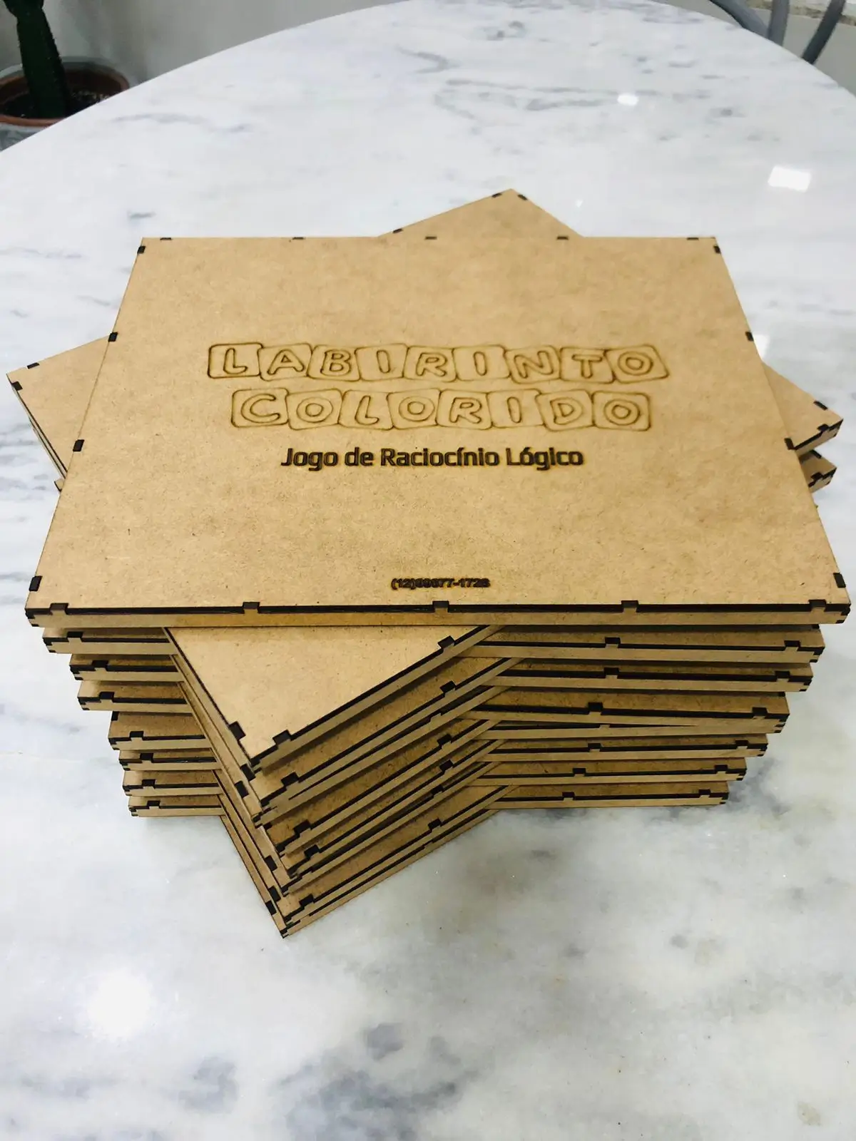 O Labirinto Colorido é um jogo de tabuleiro feito em MDF, com peças móveis coloridas e blocos de bloqueio, acompanhado de um manual de instruções.
