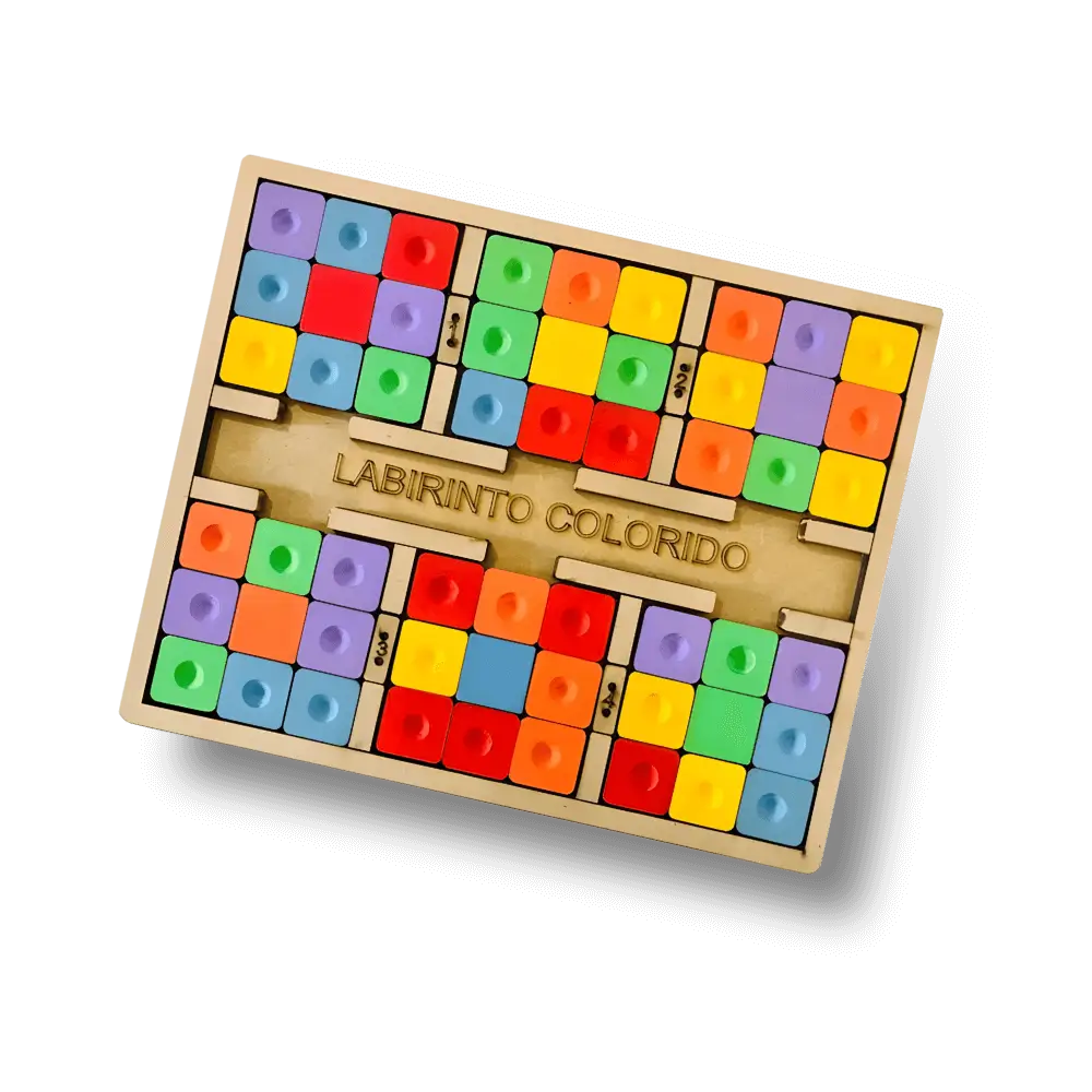 O Labirinto Colorido é um quebra-cabeça feito em MDF, projetado para estimular habilidades cognitivas e oferecer benefícios educacionais e terapêuticos. Ele é composto por um tabuleiro colorido, com peças móveis e peças de bloqueio, acompanhado de um manual de instruções.